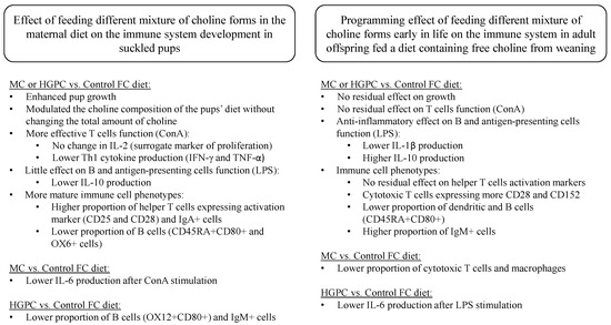 Summary of the effects of feeding different mixtures of choline forms in the maternal diet during the suckling period on the immune system development. CD, cluster of differentiation; ConA, Concanavalin A; Control, free choline; GPC, glycerophosphocholine; HGPC, high GPC; IL, interleukin; LPS, lipopolysaccharide; MC, mixed choline; TNF-α, tumor necrosis factor alpha.