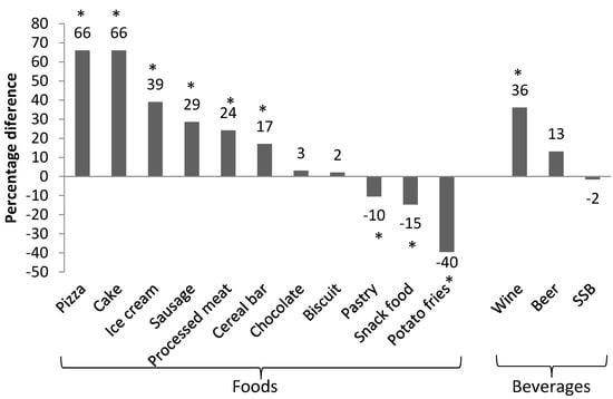 Percentage difference in median portion size (kJ) between 1995 and 2011–2012 by food category. * p < 0.05.
