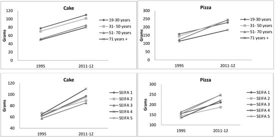Typical portion size trends of cakes and pizza from 1995 to 2011–2012 according to age and Socio-Economic Indexes for Areas (SEIFA) groups. * p < 0.05.