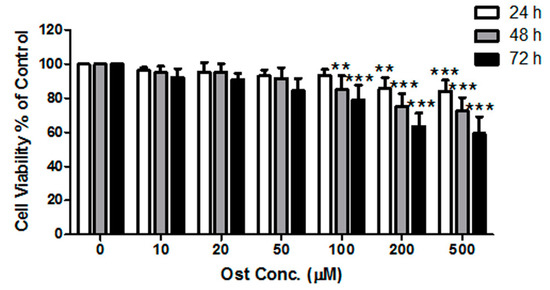 Effect of osthole on proliferation of MC3T3-E1 cells. Cells were treated with 0–500 μM of osthole for 24, 48, and 72 h. The viability was monitored with MTT assay. n = 6, One-way ANOVA followed by Tukey’s test and compared to the vehicle control, ** p < 0.01, *** p < 0.001.