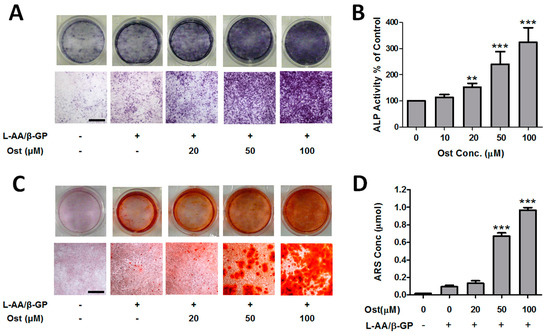 Osthole promoted osteogenic differentiation in osteoblasts. MC3T3-E1 cells were treated with 0–100 μM osthole in growth or osteogenic medium for 12 (A,B) or 24 days (C,D). (A) Representative macroscopic and microscopic photos of ALP staining cells (n = 4); (B) ALP activities were measured by ALP-AMP kit (n = 6); (C) Representative photos of ARS staining cells (n = 4); (D) cell mineralization was quantified by extraction of ARS dye (n = 4). One-way ANOVA was followed by Tukey’s test and compared to the vehicle control, ** p < 0.01, *** p < 0.001. Bar = 500 μm.
