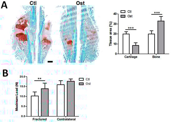 Osthole enhanced bone growth and bone strength during fracture repair. Post-operated fractured and contralateral bones were harvested at day 14 and day 28. (A) Callus sections at day 14 were stained with safranin O (cartilage)/fast green and hematoxylin (n = 4). Osthole treatment reduced cartilaginous tissue area, but increased bone tissue area; (B) the maximum load of femur samples at day 28 was determined by three-point bending (n = 8). An unpaired Student t-test was compared between control and osthole group, ** p < 0.01, *** p < 0.001. Bar = 500 μm.