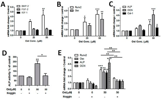 Osthole activated the BMP-2-dependent signaling pathway and BMP antagonist noggin completely inhibited osthole-mediated osteogenesis. MC3T3-E1 cells were treated with 0–50 μM osthole in osteogenic medium in the presence or absence of 100 ng/mL noggin for 12 h (A), 6 days (B,C,E), or 12 days (D). ALP activity was measured by an ALP-AMP kit; gene expression levels were detected by real-time RT-PCR. (A) n = 5, (B–E) n = 4; one-way ANOVA, followed by Tukey’s test, was compared to the vehicle control; unpaired Student t-test was compared between noggin ±, * p < 0.05, ** p < 0.01, *** p < 0.001.