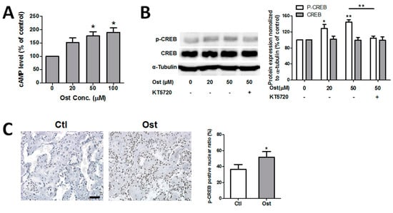 Osthole activated cAMP/CREB pathway. (A) MC3T3-E1 cells were incubated with 0–100 μM osthole in growth medium for 2 h, and cellular cAMP levels were quantified with cAMP EIA kit (n = 3); (B) Cells were treated with 0, 20, or 50 μM osthole in osteogenic medium in the presence or absence of 4 μM KT5720 for 6 h. Proteins were separated by 10% SDS-PAGE and assessed with Western blotting, and the intensity of the bands was quantified (n = 5); (C) Callus sections at day 14 were blotted with p-CREB antibody and counterstained with hematoxylin. The p-CREB-positive nuclei percentage was counted (n = 4). One-way ANOVA, followed by Tukey’s test, was compared to the vehicle control; an unpaired Student t-test was compared between KT5720 ± groups, * p < 0.05, ** p < 0.01. Bar = 50 μm.