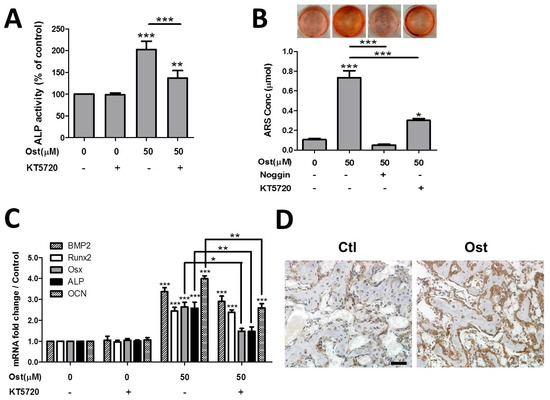 The effects of osthole-activated cAMP/CREB signaling activity was determined by the application of PKA inhibitor KT5720 during osteoblast differentiation. Co-treatment of KT5720 with osthole completely blocked the activation of p-CREB in osthole-mediated cAMP/PKA signaling (Figure 5B). PKA inhibitor markedly suppressed both ALP activation and mineralization mediated by osthole; whereas these two osteogenic markers were still significantly higher than the vehicle control after complete blockage of osthole-induced PKA signaling (Figure 6A,B). Additionally, KT5720 exposure alone did not change the viability or differentiation status of cells. All results suggested that PKA blockage only partially suppressed the osteogenic differentiation activated by osthole. Osteogenic-related gene expressions were measured in the presence or absence of KT5720. Consistent to the results of ALP activity and calcium deposit, ALP and OCN gene expression were evidently downregulated by PKA inhibitor, but they were still higher than control levels by 0.47 and 1.59 folds, respectively (Figure 6C). Expression level of Osx was markedly reduced by PKA inhibition, but BMP-2 and Runx2 levels remained almost unchanged (Figure 6C). Likewise, KT5720 had no significant influence on expression levels of osteogenic-related genes when applied alone. On the other hand, expression of Osx in healing fractured bone was assessed by IHC. The expression of Osx in the Ost group was observably higher than that of the Ctl group in osteogenic cells surrounding newly-formed bone tissue (Figure 6D).
