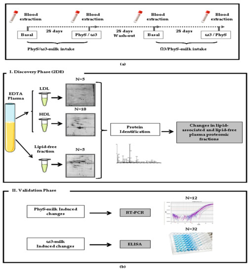 Study design. (a) Blood samples were obtained before and after the 28 day milk supplementation treatment period. A 28 day wash-out was made between treatments; (b) The study workflow of the present study comprised two phases: (I) the discovery phase in which a proteomic approach was used to identify changes in the proteomic profile of the different plasma fractions after the intake of supplemented milk (N = 5); and (II) the validation phase, where different selected proteins were validated by ELISA (N = 32) and inflammatory changes were analyzed by reverse transcription polymerase chain reaction (RT-PCR; N = 12).