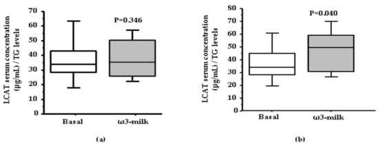 Changes on lecitin cholesterol acyltransferase (LCAT) serum levels after ω3-milk intake. Box-Plot diagrams showing LCAT concentration (µg/mL) in basal conditions and after the intake of ω3-milk, measured by a commercial ELISA. (a) No change was observed when all the volunteers were analyzed (N = 32; p = 0.346). (b) There was a significant increase in LCAT serum levels in subjects that showed a reduction in TG levels after ω3-milk intake (N = 11; p = 0.0397).