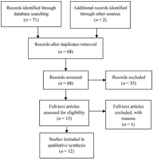 - Liberati, A.; Altman, D.G.; Tetzlaff, J.; Mulrow, C.; Gøtzsche, P.C.; Ioannidis, J.P.; Clarke, M.; Devereaux, P.J.; Kleijnen, J.; Moher, D. The PRISMA statement for reporting systematic reviews and meta-analyses of studies that evaluate health care interventions: Explanation and elaboration. J. Clin. Epidemiol. 2009, 62, e1–e34. [Google Scholar] [CrossRef] [PubMed]
