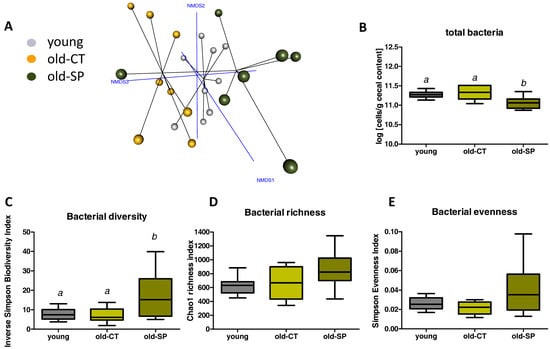 Non-metric dimensional scaling built on a Bray-Curtis distance matrix computed at the species level (A); Total bacteria measured by qPCR (B); Bacterial diversity deduced from the inverse Simpson Index (C); Bacterial richness deduced from the Chao1 Index (D); Bacterial evenness deduced from the Simpson Index (E). Old mice were fed a standard diet supplemented with or without Spirulina for six weeks and were compared to young mice fed a standard diet. Data of the whiskers plots show the minimum and maximum. Data with different superscript letters are significantly different at p < 0.05 (ANOVA).