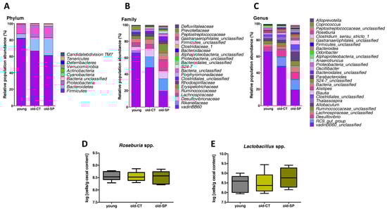 Changes in microbial populations in the caecal content, assessed by 16S profiling (A–C) and qPCR (D–F). Relative abundances of bacterial phyla (A) and bacterial taxa accounting for more than 1%, at the family (B) and genus levels (C). qPCR analysis of Roseburia spp. (D) and Lactobacillus spp. (E) in the caecal content. Old mice were fed a standard diet supplemented with or without Spirulina for six weeks and were compared to young mice fed a standard diet.