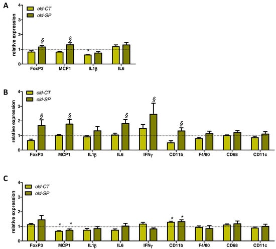 Expression of inflammatory markers in the jejunum (A), ileum (B), and colon (C). Old mice were fed a standard diet supplemented with or without Spirulina for six weeks and were compared to young mice fed a standard diet. Values are expressed as relative units with the mean of young mice values set at 1. * p < 0.05 versus young mice; § p < 0.05 versus old-CT mice (ANOVA). IFNγ, interferon gamma; IL, interleukin; MCP1, monocyte chemotactic protein-1.