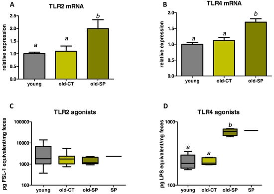 Expression of TLR2 (A) and TLR4 (B) in the ileum. Levels of TLR2 (C) and TLR4 (D) agonist activities in feces and in Spirulina, itself. Old mice were fed a standard diet supplemented with or without Spirulina for six weeks and were compared to young mice fed a standard diet. Data with different superscript letters are significantly different at p < 0.05 (ANOVA). TLR, toll like receptor.