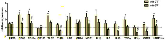 Expression of inflammatory and oxidative markers in the liver. Old mice were fed a standard diet supplemented with or without Spirulina for six weeks and were compared to young mice fed a standard diet. Values are expressed as relative units with the mean of young mice values set at 1; * p < 0.05 versus young mice; § p < 0.05 versus old-CT mice (ANOVA). COX2, cyclooxygenase 2; IFNγ, interferon gamma; IL, interleukin; LBP, lipopolysaccharide binding protein; MCP1, monocyte chemotactic protein-1; NADPHox, NADPH oxidase; TLR, toll like receptor; TNFα, tumor necrosis factor alpha.