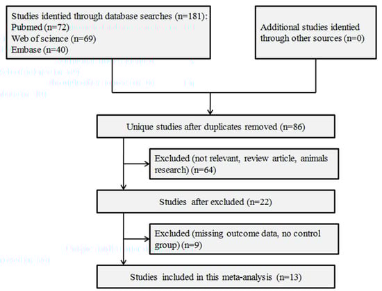 A flowchart illustrating the article search process is presented in Figure 1. The initial search strategy identified 72 studies in PubMed, 69 in Web of Science, and 40 in EMBASE. From the 181 studies, 168 were excluded. Finally, 13 studies [6,7,8,9,10,11,12,13,14,19,20,21,22] were included in this meta-analysis. The detailed characteristics of each included study are presented in Table 1. The quality scores of these studies ranged from 4 to 6, with a mean of 5.08. Detailed scoring results are presented in Table 2.