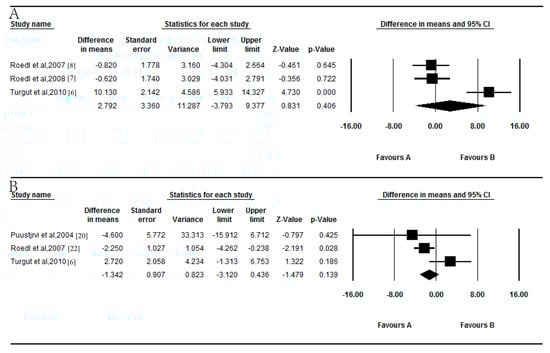 The combined results showed no difference in the serum vitamin B6 levels between POAG patients and controls (p = 0.406; Figure 2A). The WMD was 2.792 ng/mL (95% CI = −3.793 to 9.377), and there was significant between-study heterogeneity for vitamin B6 among the available studies (p < 0.0001, I2 = 89.581%). Moreover, there was no significant difference in serum vitamin B6 between EXG patients and controls (p = 0.139; Figure 2B). The WMD was 1.342 ng/mL (95% CI = −3.120 to 0.436), and there was no significant heterogeneity for vitamin B6 between the available studies (p = 0.082, I2 = 59.982%).