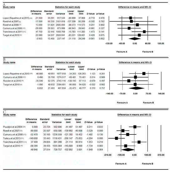 In the combined results, the levels of serum vitamin B12 exhibited no difference between POAG patients and controls (p = 0.952; Figure 3A). The WMD was 0.933 pg/mL (95% CI = −31.116 to 29.249), and there was no significant between-study heterogeneity for vitamin B12 among the available studies (p = 0.555, I2 = 0.000%).