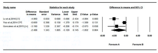 The combined results showed that there was no significant difference in serum vitamin D levels between POAG patients and controls (p = 0.064; Figure 4). The WMD was 2.488 ng/mL (95% CI = −5.120 to 0.145), and there was significant between-study heterogeneity for vitamin D among the available studies (p < 0.001, I2 = 87.229%).