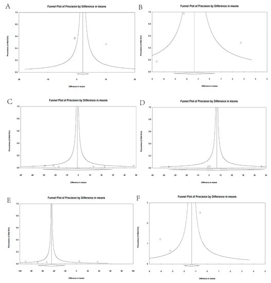 There were no obvious asymmetries in the funnel plots. The p-values exceeded 0.05 for the following groups: vitamin B6 in POAG (t = 3.369, p = 0.07, 95% CI = −13.19 to 69.22; Figure 5A), vitamin B6 in EXG (t = 0.271, p = 0.83, 95% CI = −29.92 to 31.22; Figure 5B), vitamin B12 in POAG (t = 0.463, p = 0.67, 95% CI = −3.43 to 4.80; Figure 5C), vitamin B12 in NTG (t = 0.732, p = 0.54, 95% CI = −13.44 to 9.53; Figure 5D), vitamin B12 in EXG (t = 0.271, p = 0.83, 95% CI = −29.92 to 31.22; Figure 5E), and vitamin D in POAG (t = 1.332, p = 0.41, 95% CI = −40.72 to 33.00; Figure 5F).