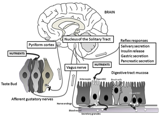 Schematic representation of the taste circuitry. The gustatory system is represented by taste cells in taste buds and their gustatory nerves. Corresponding to the gastrointestinal system, there are two enteroendocrine cells (EEC), one that is open to the lumen releasing cholecystokinin (CCK) and glucagon-like peptide 1 (GLP-1) in response to luminal nutrients and one that is closed. Vagal fibers are located underneath the GI mucosa in close contact with hormone secretions. The signals from the gustatory system reach the rostral nucleus of the solitary tract whereas visceral impulses terminate at the caudal nucleus of the solitary tract. From the nucleus of the solitary tract, gustatory and visceral information projects to several brain regions including the amygdala, the hypothalamus, and the ventral posterior nucleus of the thalamus. These regions are involved with ingestive motivation, physiological reflexes, and energy homeostasis. Reproduced with permission from [50].