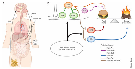 - Williams, K.W.; Elmquist, J.K. From neuroanatomy to behavior: Central integration of peripheral signals regulating feeding behavior. Nat. Neurosci. 2012, 15, 1350–1355. [Google Scholar] [CrossRef] [PubMed]