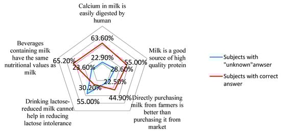 In conclusion, knowledge gaps surrounding dairy products and self-perception bias exist in Chinese urban adults, which impact the quantity and quality of dairy intake. Since this study only recruited an urban population, knowledge of and attitude toward dairy products in the rural population remains unknown and is expected to be worse. According to the Chinese nutritional problem of insufficient intake of dairy products, nutritional intervention should be conducted (1) to enhance dairy knowledge, especially regarding LI; (2) to change the perception bias of dairy products; and (3) to educate people in the effective selection of appropriate dairy products that suit their health status.