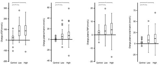 Changes in thiamine forms among individuals randomized to receive placebo (control), low (low concentration (2 g/L)), or high (high concentration (8 g/L)) thiamine-fortified fish sauce. eThDP, plasma thiamine, plasma TMP, and plasma total thiamine responses expressed as change (post-intervention—baseline). Solid horizontal lines indicate median change, the box represents the interquartile range (IQR), the whiskers represent 1.5 times the IQR, and circles indicate outliers. eThDP, erythrocyte thiamine diphosphate; TMP, thiamine monophosphate. Between group differences indicated by, * p ≤ 0.01.