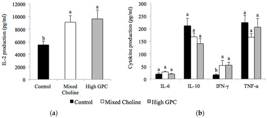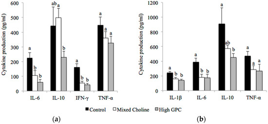 Cytokine production by splenocytes after ex vivo stimulation with Concanavalin A (ConA) (a) or lipopolysaccharide (LPS); (b) from lactating dams fed Control (100% FC) (n = 6), Mixed Choline (MC; 50% PC, 25% FC, 25% GPC) (n = 6) or High GPC (HGPC; 75% GPC, 12.5% PC, 12.5% FC) (n = 6) diets. FC, free choline; GPC, glycerophosphocholine; PC, phosphatidylcholine. Values are presented as mean ± SEM. p value of the main effect of diet analyzed by one-way ANOVA. Multiple comparisons between diet groups have been performed with Duncan adjustment. Means within a row that do not share a common superscript letters a, b are significantly different (p < 0.05).