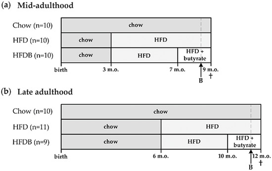 Schematic overview of the study design. (a) Mid-adulthood, exposure of the high-fat died HFD started at 3 m.o. in the HFD and HFDB groups. At 7 months of age, the butyrate intervention (HFD supplemented with 5% w/w butyrate) started in the HFDB group; (b) Late adulthood, exposure to the HFD started at 6 months of age in the HFD and HFDB groups, and a butyrate intervention initiated at 10 months of age in the HFDB group. Body weight (individual) and food intake (cage level) were monitored weekly. Blood samples were taken after five hours of fasting. At 9 m.o. and 12 m.o., mice were sacrificed and both liver and adipose tissues were harvested. These tissues were subsequently processed for immunohistochemical staining. B = blood sample collection; HFD = high-fat diet; HFDB = high fat diet enriched with butyrate; m.o. = months old.