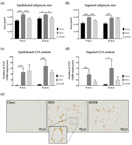 To assess the degree of inflammation in adipose tissue, the number of adipocytes infiltrated by macrophages—known as crown-like structures (CLS)—has been determined. Both mid- and late-adult mice on HFD showed higher numbers of CLS in epididymal adipose tissue as opposed to Chow-fed mice (Kruskal Wallis: p < 0.001; mid: χ2(1) = 13.50, late: χ2(1) = 13.02) (Figure 2c). No effects of butyrate on CLS number in epididymal adipose tissue were observed. In inguinal adipose tissue, the number of CLS was increased after HFD exposure in both mid- (Kruskal-Wallis: p < 0.01; χ2(1) = 7.30) and late- (Kruskal-Wallis: p < 0.02; χ2(1) = 6.16) adult mice (Figure 2d). No significant differences in the number of CLS in inguinal adipose tissue were observed between HFD and HFDB mice (Figure 2d). As scales differ between Figure 2c,d, caution should be taken when interpreting these results. In Figure 2e, examples of epididymal adipose tissue stained for macrophages are shown.