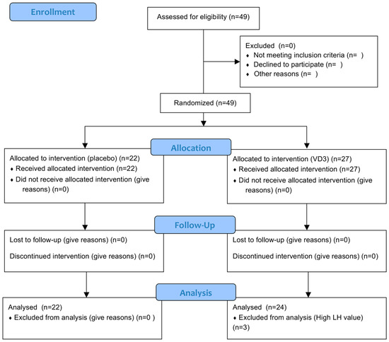 - Drakopoulos, P.; Vijver, v.d.A.; Schutyser, V.; Milatovic, S.; Anckaert, E.; Schiettecatte, J.; Blockeel, C.; Camus, M.; Tournaye, H.; Polyzos, N.P. The effect of serum vitamin D levels on ovarian reserve markers: A prospective cross-sectional study. Hum. Reprod. 2017, 32, 208–214. [Google Scholar] [CrossRef] [PubMed]