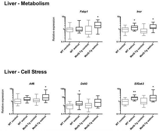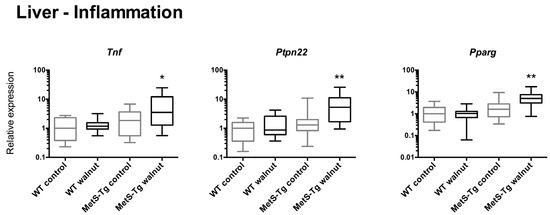 - Choi, Y.; Abdelmegeed, M.; Akbar, M.; Song, B.-Y. Dietary walnut reduces hepatic triglyceride content in high-fat-fed mice via modulation of hepatic fatty acid metabolism and adipose tissue inflammation. J. Nutr. Biochem. 2016, 30, 116–125. [Google Scholar] [CrossRef] [PubMed]
