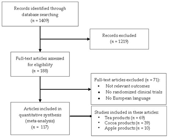 A comprehensive search on PubMed and Web of Science databases was conducted in July 2015. Search terms included a combination of keywords referring to: (1) bioactive (polyphenols, flavonoids, flavanols, flavan-3-ol, (epi)catechin, (epi)gallocatechin gallate, theaflavins, thearubigin, and procyanidin); (2) food source (apple, tea, and cocoa); (3) type of study and participants (trial, experiment, study, intervention; human, subjects, men, women, patients, volunteers, and participants); and (4) cardiometabolic outcomes (BMI, WC, total cholesterol, LDL cholesterol, HDL cholesterol, and TAGs). No type of restriction was applied during the electronic searches.
