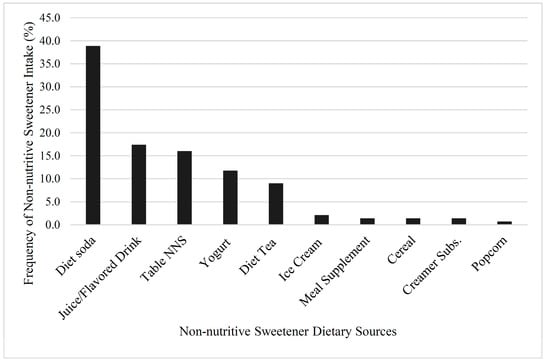 Sucralose was the most prevalent NNS type in this sample’s diet, followed by aspartame, acesulfame potassium, and saccharin. This corresponds well to NNS prevalence in food and beverage products, as sucralose is the most common, followed by very similar levels for acesulfame potassium and aspartame [58]. The most frequently consumed sources of NNS in this study were diet soda, juice and flavored drinks, and tabletop NNS, which correlated with national consumption trends that reported that diet soda was the most prevalent source of NNS, followed by reduced-calorie beverages (light fruit juices and lemonades) [34,35]. With previous study designs, participants only reported general details regarding their NNS use, such as the frequency and/or quantity of just diet soda intake [10,11,12,26,27,28,29,32,33]. This approach is problematic, as specific beverage types like juice drinks, mixes, teas, or other non-carbonated NNS beverages were not captured. Focusing on diet soda intake as the only NNS source underestimates NNS intake and limits the accuracy of NNS intake data, thereby decreasing the scope and understanding of the potential health benefits and/or problems.