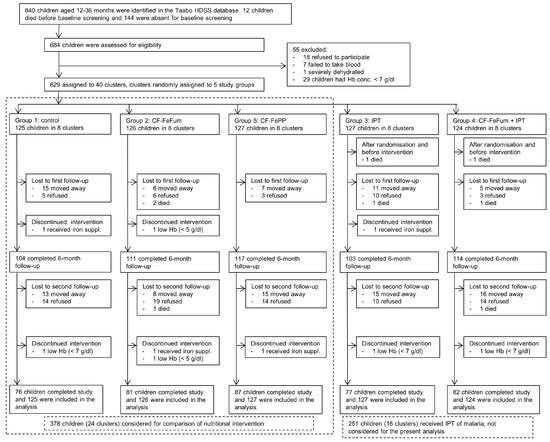 We present a secondary analysis of the larger study with key findings published elsewhere [15]. The primary analysis comprised five study groups (Figure 1) and focused on the interaction of iron fortified CF and IPT of malaria on Hb concentration (primary outcome). We selected 629 eligible children at the baseline screening and grouped them into 40 clusters based on proximity of their residence, with at least five clusters in each of the five study villages. Each cluster included between 13 and 18 children. Inclusion criteria were as follows: (i) Hb ≥ 7 g/dL; (ii) no major chronic illnesses, as determined by a study physician; (iii) anticipated residence in the study area for the 9-month intervention; and (iv) no known allergies to albendazole (treatment of choice against soil-transmitted helminthiasis). The clusters were randomly assigned to five study groups by drawing cluster numbers from a hat (urn randomization) together with village authorities. The study groups were: group 1, no nutritional intervention (continuation with the normal diet) and IPT-placebo; group 2, iron fortified CF containing FeFum + NaFeEDTA (FeFum) and IPT-placebo; group 3, no nutritional intervention and IPT of malaria (3-month intervals, using sulfadoxine-pyrimethamine and amodiaquine); group 4, iron fortified CF containing FeFum + NaFeEDTA (FeFum) and IPT of malaria (3-month intervals, using sulfadoxine-pyrimethamine and amodiaquine); and group 5, iron fortified CF containing FePP + NaFeEDTA (FePP) and IPT-placebo. In the current analysis, we focus solely on the iron status of children in the study groups receiving the iron fortified CF (groups 2 and 5) and compare changes in children’s iron status biomarkers over the 9-month intervention with children in the control group (group 1). Hence, 251 children (groups 3 and 4; 16 clusters overall) were excluded from the current analysis.
