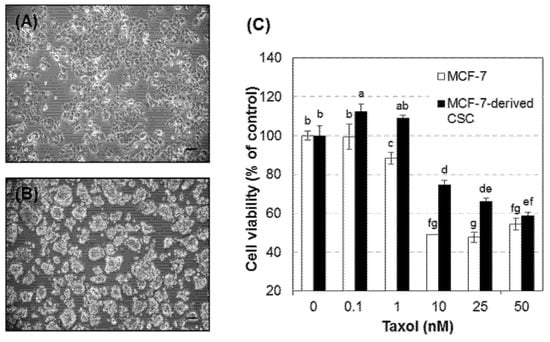 Chestnut leaf extract-treated CSCs were more susceptible to Taxol treatment than untreated CSCs. Both MCF-7-derived CSCs (A) and their parental cells (B) were treated with chestnut leaf extract in the presence of Taxol at various concentrations (0, 0.1, 1, 10, 25, and 50 nM). The CSCs exposed to the extract became more vulnerable to Taxol at ≥1 nM, compared to the cells that were not exposed to the extract. CC, Castanea crenata leaf extract, 50 μg/mL. N = 3; error bars, mean ± SEM. Values not sharing common letter on bar indicate statistically significant difference from each other (p < 0.05).
