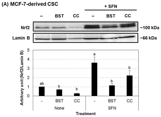Chestnut leaf extract suppressed nuclear translocation of Nrf2 protein in MCF-7-derived CSCs and their counterparts. Both MCF-7-derived CSCs (A) and their parental cells (B) were treated with either chestnut leaf extract (CC, 50 μg/mL) or an Nrf2 inhibitor, brusatol (BST, 40 nM) in the absence or presence of an Nrf2 activator, sulforaphane (SFN, 5 μM). Representative immunoblot image (upper) and quantitative data (lower). N = 3; error bars, mean ± SEM. Values not sharing common letter on bar indicate statistically significant difference from each other (p < 0.05).