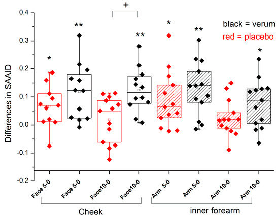 Box plot of the differences of SAAID to the initial values measured at the cheek and inner forearm. + p < 0.05 between placebo and verum; * p < 0.05, ** p < 0.01 to initial value. The box presents 50% of the data. The bottom and top of the box are always the first and third quartiles and the solid line box is always the second quartile, the median.