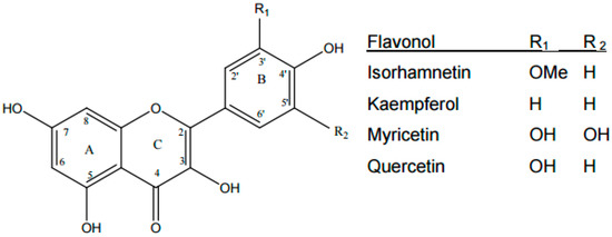 Chemical structure of flavonols: quercetin is the most abundant in the diet and is found in onions, broccoli, apples, tea and red wine.