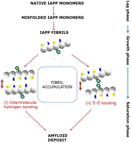 However, during IR and/or β-cell dysfunction, the expression of IAPP increases to that of insulin, resulting in the misfolding of pro-IAPP in the ER and/or the decreased processing of pro-IAPP in the secretory granule. The resultant misfolded and/or unprocessed pro-IAPP present in the secretory granule is released along with insulin and, extracellularly, further undergoes structural changes to initiate fibril formation. Additionally, misfolded pro-IAPP in the secretory granules may cause the contents within the granules to be targeted to the lysosome to be degraded, as the lysosomal system is responsible for the removal of excess or misfolded peptides, such as IAPP and insulin. Thus, it is also possible that fibril formation could occur intracellularly as a result of the aggregation of pro-IAPP in the lysosome, with the nascent fibrils released into the extracellular space [127]. Once these fibrils are formed either within or outside the β-cells, they provide the ‘seed/nucleus’ required to facilitate the second stage, or rapid amyloid fibril accumulation [128]. The process of further fibril formation is stabilised by intermolecular hydrogen bonding [129] to form small β-sheet cytotoxic oligomers, which eventually form the amyloid deposits. Alternatively, the protein self-assembly process involves π–π interaction, in which the aromatic residues of IAPP interact with each other via π-stacking to form the amyloid [130] (Figure 3).