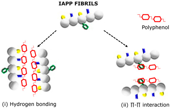 A more attractive approach clinically is via the dissociation of amyloid fibrils during their formation in order to disrupt the β-pleated sheets and to prevent amyloidosis [146], and has been demonstrated using short synthetic peptides, containing the self-recognition motifs of the protein, engineered to destabilise the abnormal conformation to correct protein misfolding [146]. This has also been shown by binding IAPP monomers with ion ligands [147] to inhibit oligomerisation and effectively reduce amyloid cytotoxicity [148], and is thought to be the mechanism by which tetracycline exerts anti-diabetic activity [91]. A unique feature of tetracycline is that it contains an aromatic ring that facilitates the interaction with lipophilic residues of monomers (π stacking) as polar groups that can form hydrogen bonds with specific residues to strengthen the drug–protein interaction [149,150]. Likewise, polyphenols have been shown to act as small molecule inhibitors to prevent amyloid formation via similar mechanisms. According to the “π stacking” theory, the aromatic rings of polyphenols may competitively interact with aromatic residues in IAPP by sandwiching between two aromatic residues to prevent π–π interaction and block the self-assembly process [92] (Figure 4). Alternatively, the phenolic hydroxyl group of polyphenols may inhibit amyloid fibril formation by binding to the hydrophobic residues in IAPP to modulate oligomerisation [151] (Figure 4). This is similar to the mechanism by which quercetin and epigallocatechin gallate (EGCG) has also been shown to inhibit 11β-HSD1, by binding to the active site by hydrogen bond interaction [152,153].