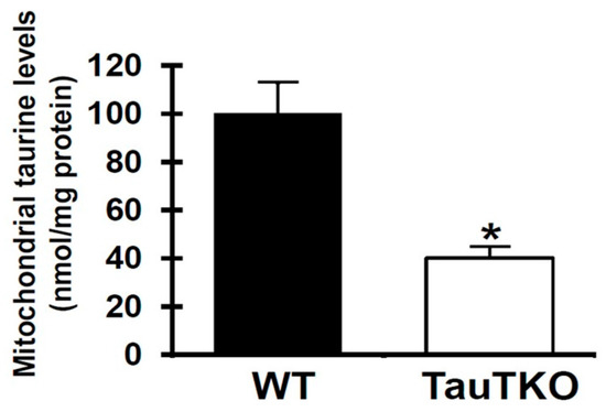 Ito et al. [6] have shown that global deletion of the taurine transporter gene suppresses taurine uptake by the heart, as shown by the presence of nondetectable levels of taurine in the cytosol of the TauTKO heart vs. nearly 28 mM in the wild-type (WT) heart. However, the mitochondria of the 3-month-old TauTKO heart appear to be resistant to the loss of taurine, as mitochondrial taurine content of the TauTKO heart was 40 nmol/mg protein, which is only 60% less than the taurine content of the age-matched, WT heart (Figure 1).