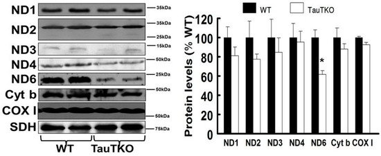 ND6 is reduced in TauTKO hearts. The mitochondrial fraction was isolated from homogenized hearts and then subjected to western blot analyses. The left panel shows representative gels for ND1, ND2, ND3, ND4, ND6, Cyt b (cytochrome b) and COX I (cytochrome c oxidase I), with succinate dehydrogenase (SDH) serving as the loading control. The right panel shows the means ± SEM of the mitochondrial protein/SDH ratio of 6–9 different hearts. Values are expressed relative to wild-type (WT), where WT is fixed at 100%. * p < 0.05.