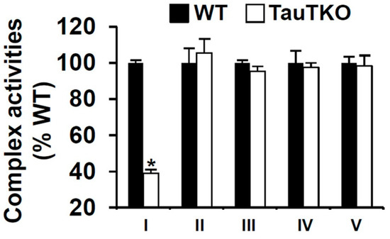 Taurine depletion decreases complex I activity. Isolated mitochondrial fractions of WT and TauTKO hearts were assayed for the activities of complexes I–V. Values of individual complexes shown represent means ± SEM of 4–6 different hearts. * p < 0.05.