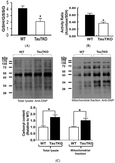 Reduced flux of electrons through the respiratory chain is often associated with the diversion of electrons from the respiratory chain to the acceptor, oxygen, forming in the process superoxide anion. To determine if the mitochondria of the TauTKO heart are oxidatively stressed, the glutathione redox ratio (GSH/GSSG) of TauTKO hearts was determined. Supporting the view that the taurine deficient heart is oxidatively stressed, it was shown that the glutathione redox ratio was 2-fold less in the 3-month-old TauTKO heart than in that of the age-matched, WT heart (Figure 4A). However, the levels of ROS differ between various organelles within the cell, with mitochondria being unique because of their ability to not only generate superoxide but also to degrade ROS [21]. Therefore, to determine if taurine deficiency enhances oxidative stress in the mitochondria, the activity of the ROS-sensitive, citric acid cycle enzyme, aconitase, was assayed. As seen in Figure 4B, taurine deficiency is associated with a 30% decrease in aconitase activity. Another marker of oxidative stress is protein carbonylation, in which amino acid residues, such as lysine, arginine, proline and threonine, undergo oxidation to form a protein carbonyl derivative containing an aldehyde or carbonyl group [22]. Figure 4C shows that the amount of carbonylated protein in the cellular lysate and mitochondrial extract of the taurine deficient heart increased 50%. Together, these data show that taurine deficiency is associated with an increase in oxidative stress.