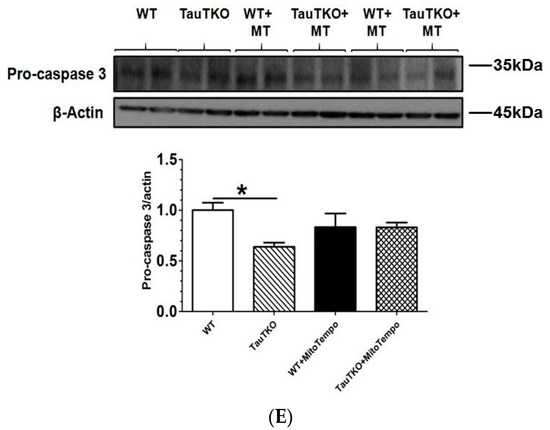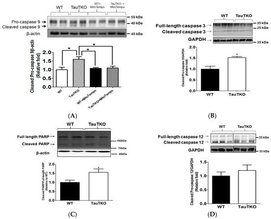 The active form of caspase 9 is a mitochondrial-localized protease, which initiates an apoptotic cascade by cleaving pro-caspase 3 to its active, cleaved caspase 3 form. Figure 5B shows that the content of the active, cleaved form of caspase 3 is increased in 3-month-old TauTKO mice relative to that of the age-matched control WT mice, causing the ratio of cleaved caspase 3/pro-caspase 3 to increase 50% in young TauTKO hearts relative to that of young WT hearts. Activation of caspase 3 subsequently cleaves poly-ADP (ribose) polymerase (PARP) and induces apoptosis. Indeed, as shown in Figure 5C, a significant 50% increase in the cleaved levels of PARP is observed in TauTKO hearts. In contrast to caspases 3 and 9, the level of the cleaved, active form of caspase 12, which is activated following initiation of UPR by ER stress, was identical in the 3 month- old TauTKO and WT hearts (Figure 5D). Treatment of 3-month-old TauTKO mice with MitoTempo abolishes the significant decrease in pro-caspase 3 content but the mitochondrial antioxidant has no effect on pro-caspase 3 levels in WT mice (Figure 5E).