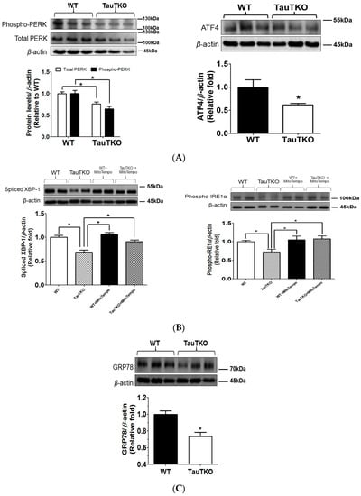 Crosstalk between mitochondria and the sarcoplasmic reticulum of the heart has been observed in specific mitofusion 2-containing mitochondrial-reticular microdomains [23]. It has been demonstrated that ROS and Ca2+ are capable of promoting crosstalk between the two organelles [24,25]. According to Ramila et al. [11], Ca2+ handling by the ER (SR) of the TauTKO heart is defective, a change attributed to impaired activity of several protein kinases and a phosphatase. Because high levels of Ca2+ are required for normal protein folding by the ER [24], the size of the ER stores and the activity of the SR Ca2+ ATPase are determinants of ER stress [26]. Moreover, ROS perturbs the ER, thereby initiating ER stress, in part by disrupting proper disulfide-sulfhydryl interchange and disulfide bridge formation via the oxidoreductases that require an oxidative environment in the ER lumen to promote proper protein folding and ER function [27]. Because of the link between mitochondria and the ER, as well as the importance of ER stress in the initiation of apoptosis, we examined the status of two of the three transmembrane sensor proteins (PERK and IRE1) and their downstream effectors; the two UPR pathways examined are involved in the initiation of apoptosis [28]. As shown in Figure 6A, the content of phosphorylated PERK and ATF4, which are components and biomarkers of the PERK pathway, are reduced 25–35% in the 3-month-old TauTKO heart relative to that of the WT control heart. Similarly, two biomarkers of the IRE1 signaling pathway, phospho-IRE1 and spliced XBP-1, were 20% lower in the 3-month-old TauTKO heart than in the 3-month-old WT heart, an effect that was diminished upon treatment of the animal with MitoTempo (Figure 6B). Common to both the PERK and IRE1 pathways is the chaperone, GRP78, which in normal ER is associated with the transmembrane sensor proteins, maintaining them in an inactive state. A key beginning event in the initiation of UPR is the dissociation of GRP78 from the three transmembrane sensor proteins, freeing them to activate distinct UPR pathways. In most examples of ER stress and UPR signaling, GRP78 is upregulated and UPR signaling is stimulated [29,30]. However, as seen in Figure 6C, levels of GRP78 are reduced in the 3-month-old TauTKO heart, an effect associated with inhibition of UPR signaling. The pattern that develops in the 3-month-old TauTKO heart is the mirror image of that seen normally during initiation of ER stress and activation of UPR signaling, suggesting that UPR is not initiated in the young TauTKO heart.