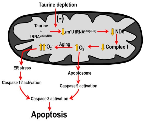 In aging, oxidative stress initiates ER stress, which upon stimulation of the UPR pathways, activates caspase 12, an initiating caspase that further stimulates caspase 3 and apoptosis. The rise in cardiac apoptosis promotes the development of cardiomyopathy, increasing mortality in taurine deficiency. Thus, taurine is an important nutrient that is required for normal mitochondrial function. Hence, taurine deficiency reduces lifespan by promoting mitochondrial-dependent and ER stress-mediated apoptosis.