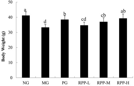 Effect of rambutan peel phenolic (RPP) on body weight of mice after 5 weeks. NG: Normal group; MG: streptozotocin (STZ), Model group; PG: STZ, DMBG 10 mg/kg; RPP-L: STZ, 50 mg/kg RPP; RPP-M: STZ, 100 mg/kg RPP; RPP-H: STZ, 200 mg/kg RPP. Different lower-case letters indicate significant differences (p < 0.05).