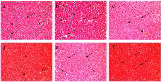 Effect of RPP on liver histology (H&E stain, 200×). (a) NG (Normal group); (b) MG (STZ, Model group); (c) PG (STZ, DMBG 10 mg/kg); (d) RPP-L(STZ, 50 mg/kg RPP); (e) RPP-M (STZ, 100 mg/kg RPP); (f) RPP-H (STZ, 200 mg/kg RPP).