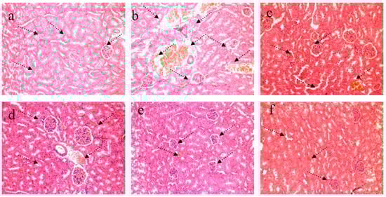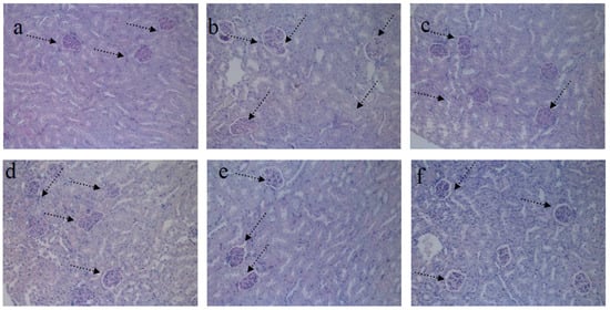 Effect of RPP on kidney histology (H&E stain, 200×). (a) NG (Normal group); (b) MG (STZ, Model group); (c) PG (STZ, DMBG 10 mg/kg); (d) RPP-L(STZ, 50 mg/kg RPP); (e) RPP-M (STZ, 100 mg/kg RPP); (f) RPP-H (STZ, 200 mg/kg RPP).